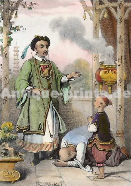 Chine. Lithographie de L. Lassalle. Illustration pour conte. ca 1840. Bon état. Aquarellée à la main. 12,5x9cm. Montée sous passe-partout.