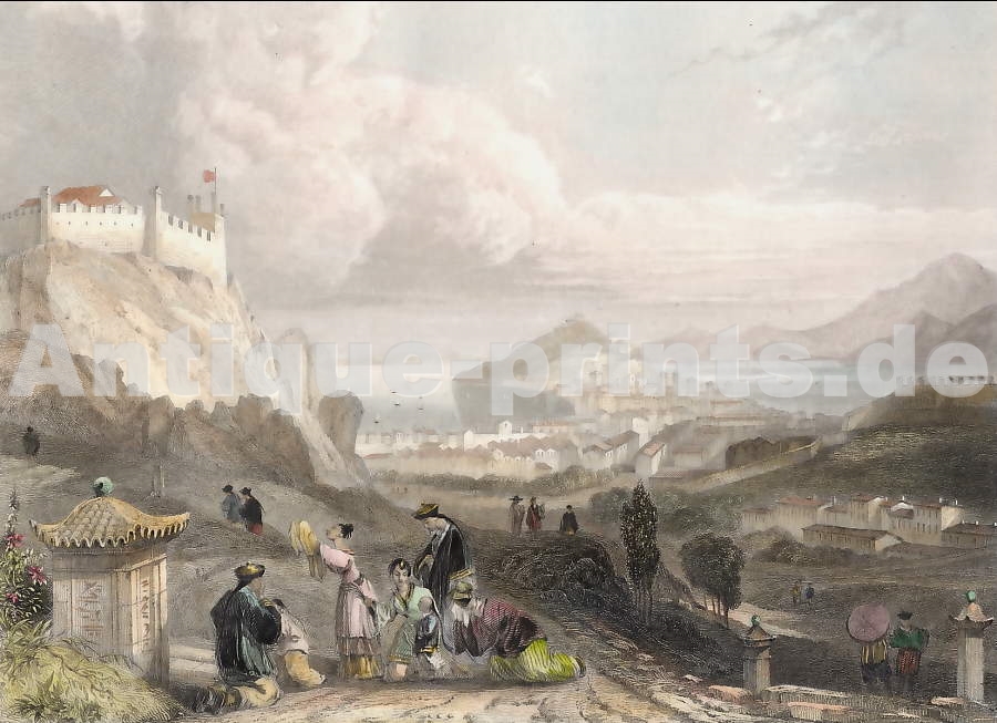Greece. Original miniature on steel engraved by E. Finden after W. Turner. 1832. Very good condition. Hand-coloured. 10x9cm. Matted.