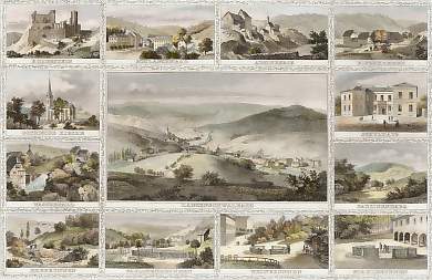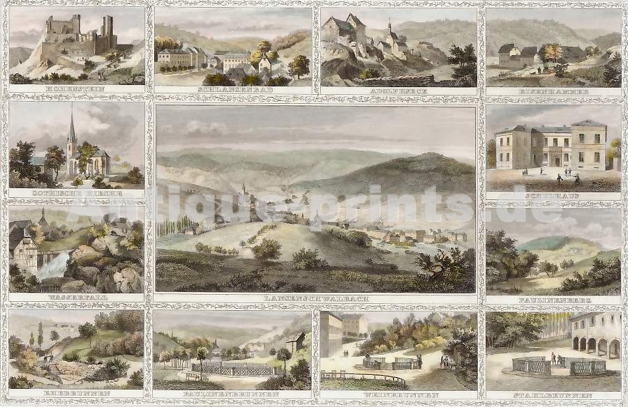Deutschland, Allemagne, Gravure, Stich, Engraving, Langenschwalbach, Bad Schwalbach, Hohenstein, Schlangenbad, Adolfseck, Eisenhammer, Schulhaus, Paulinenberg, Stahlbrunnen, Weinbrunnen, Paulinenbrunnen, Ehebrunnen, Wasserfall, Gothische Kirche