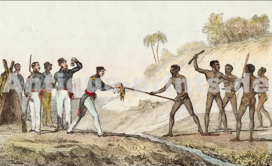 Mollucas Islands. Original wood engraving drawn by Taylor, engraved by Barbant. 1889. Foxing in the margins. Hand-coloured. 19x13cm. Matted.