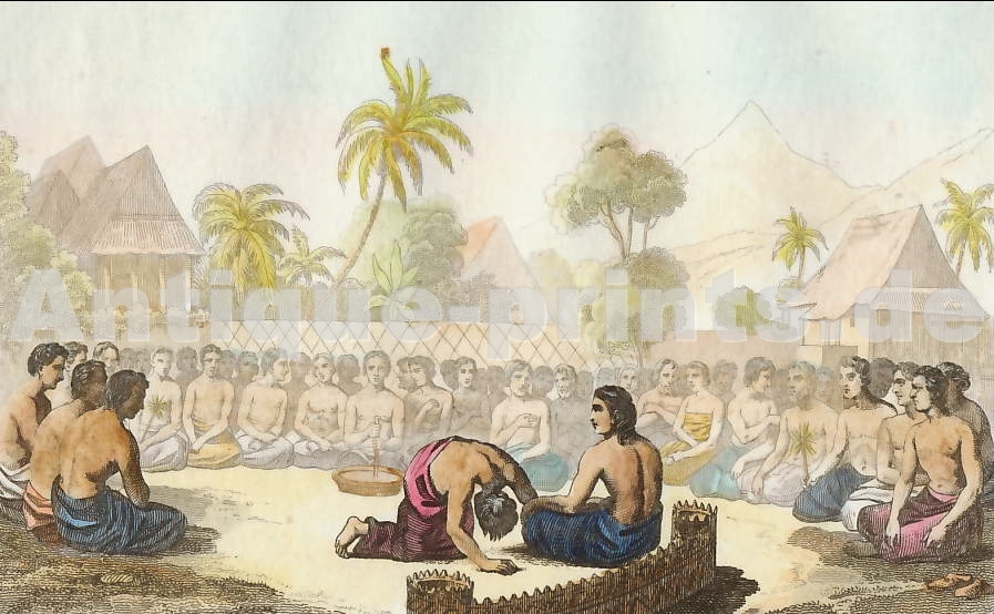 Timor. Original steel engraving drawn by Danvin, engraved by Langlois. 1836. Very good condition. Hand-coloured. 13,5x9cm. Matted.
