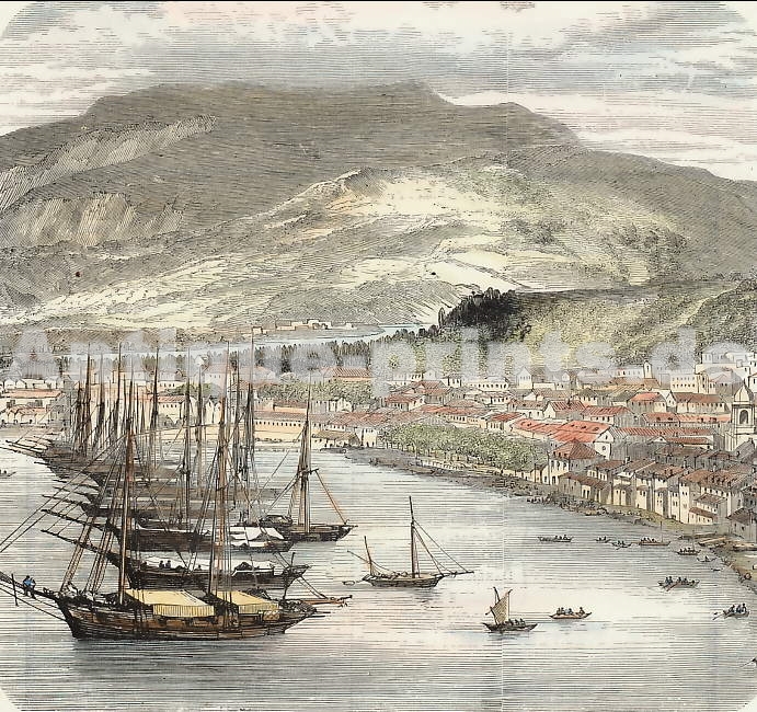 Guyana. Original wood engraving drawn by T. Weber. 1878. Good condition. Hand-coloured. 19x13cm. Matted.