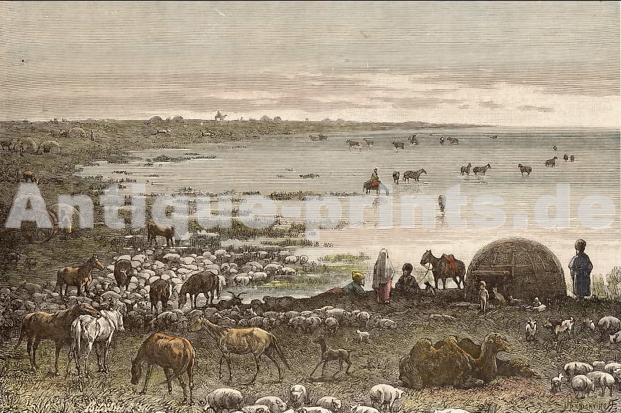 Asie Centrale. Gravure sur bois, gravée par Hildibrand d´après Pranishnikoff. 1881. Très bon état. Aquarellée à la main. 19x13cm. Montée sous passe-partout.