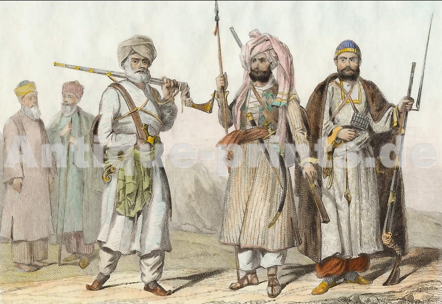 Afghanistan. Gravure sur bois, gravée par A. Kohl d´après C. Barclay. 1884. Rousseurs dans les marges. Aquarellée à la main. 19x13cm. Montée sous passe-partout.