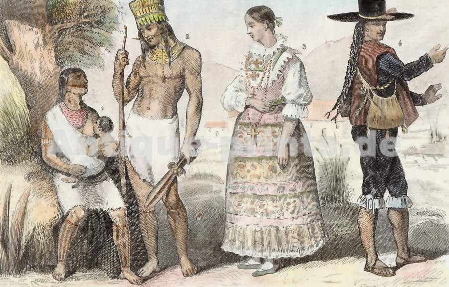 Paraguay. Original wood engraving, engraved by H. Thiriat. 1890. Light foxing in the margins. Hand-coloured. 18,5x12,5cm. Matted.