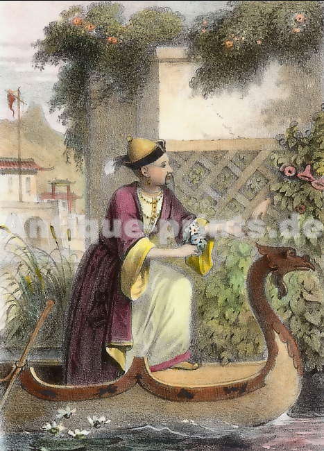 Chine. Lithographie de L. Lassalle. Illustration pour conte. ca 1840. Bon état. Aquarellée à la main. 12,5x9cm. Montée sous passe-partout.