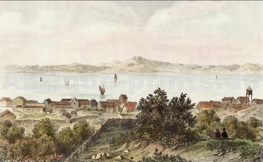 Grèce. Gravure sur acier, gravée par M. J. Starling d´après W. H. Bartlett. 1838. Bon état. Aquarellée à la main. 19x12,5cm. Montée sous passe-partout.