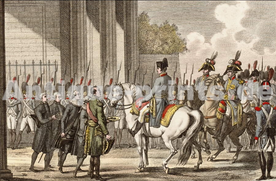France. Aquatinte (gravée par C. Levachez d´après C. Vernet). Sans titre ni signatures. Retirage XIXème. Très bon état. Aquarellage d´époque. 17,5x13,5cm. Avec cadre: 26,5x23cm.