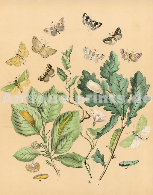 1. Cilix Glaucata, 2. Drepana Binaria, 3. Drep. Falcataria, 4a-c. Harpyia Vinula, 5. Harp. Erminea, 6. Harp. Bifida, 7a&b. Hybocampa Milhauseri, 8a-c. Stauropus Fagi, 9. Ptilophora Plumigera, A. Stieleiche, Quecus Pedunculata, B. Korbweide, Sal. Viminalis, C. Hainbuche, Carp. Butulus.