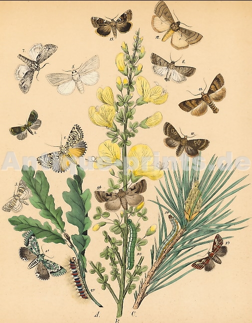 1. Diphthera Ludifica, 2a&b. Moma Orion, 3. Bryophila Perla, 4. Br. Algae, 5. Arsilonche Albovenosa, 6. Caradrina Quadripuncta , 7. Asteroscopus Sphinx, 8a&b. Panolis Piniperda, 9a&b. Taeniocampa Gothica, 10. Taen. Stabilis, 11. Orthosia Helvola, 12. Mesogona Acetosellae, 13. Calymnia Affinis, A. Traubeneiche, Querc. Robur., B. Besenpfrieme, Sarothamnus Scoparia, C. Gem. Kiefer, Pin. Sylvestris.