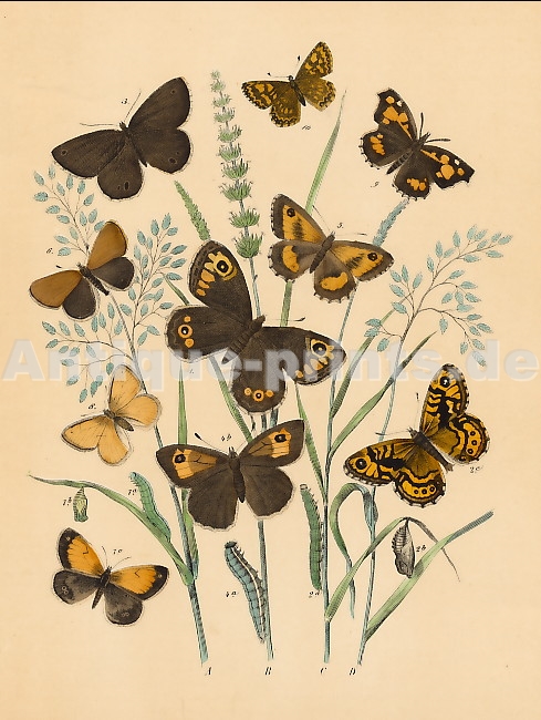 1. Pararge Maera, 2a-c. par. Megaera, 3. Epinephele Hyperanthus, 4a&b.Ep. Janira, 5. Ep. Tithonus, 6. Coenonympha Iphis, 7a-c. Coen. Arcania, 8. Coern. Pamphilus, 9. Libythea Celtis, 10. Nemeobius Lucina, A. D. Rispengras, Poa Glauca, B. C. Kammgras, Cynosorus Cristatus.