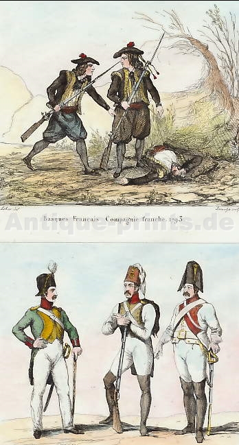 Frankreich & Spanien. Stahlstich. Basques Francais, Compagnie Franche, 1793: von Lacauchie nach Lehner. Troupes Espagnoles (Artilleur, Fusilier Regt. D´Estramadure, Dragon De Zamora): von Lacauchie nach Martinet. 1835. Sehr guter Zustand. Handkoloriert. 19,5x10,5cm. Mit Passepartout.