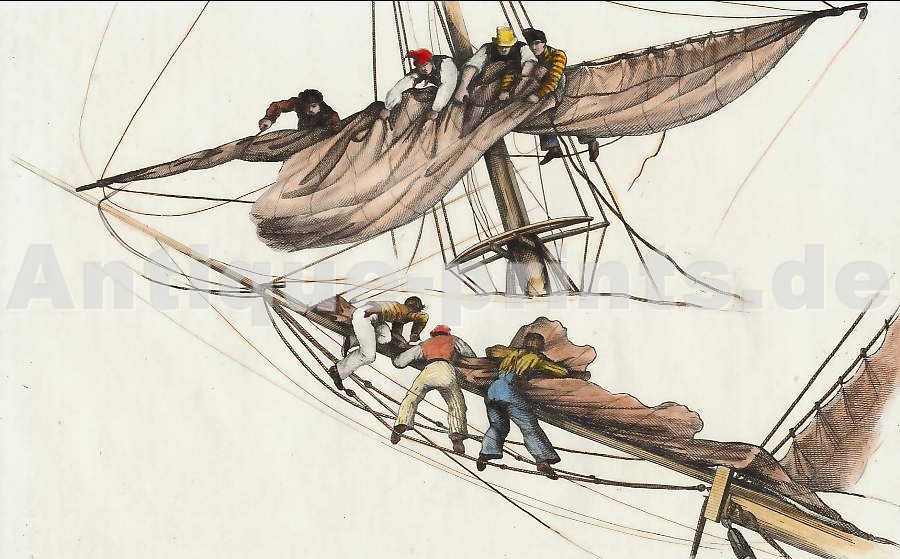 Marine. Gravure sur bois. 1873. Bon état, légères salissures dans les marges. Aquarellée à la main. 22x14cm. Montée sous passe-partout.