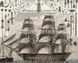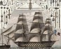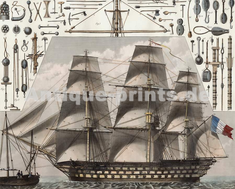 1. French Ship of the Line, Showing the Outfit of a Shit, 2. Normandy Fishing-Smack, 3. Mainyard with its Jeers, 4. Upper Part of a Mainmast, 5-6. Caps, 7. Dead-Eyes, 8. Tackle with Runner, 9. Winding Tackle in Threefold Blocks, 10-16. Various Blocks and Dead-Eyes, 17-18. Pitch Ladles, 19. Axe, 20. Polo-Axe, 21. Scraper, 22. Double Scraper, 23. Horse-Bit, 24. Adze, 25. Hatchet, 26-27. Caulking Tools, 28-29. Trucks, 30. Knobbed Rope, 31-32ab. Caulking Mallets, 33. Tar Brush, 34. Callipers, 35-40. Implements for Serving Guns, 41-49. Various Kinds of Shot.