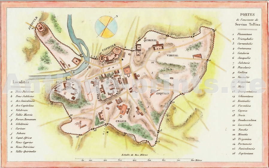 Rome Ancienne. Lithographie. Époque Empire. Très bon état, sans marges, collée sur papier. Rehaussée à la gouache et à l´aquarelle, couleurs d´époque. 19x15cm. Montée sous passe-partout.
