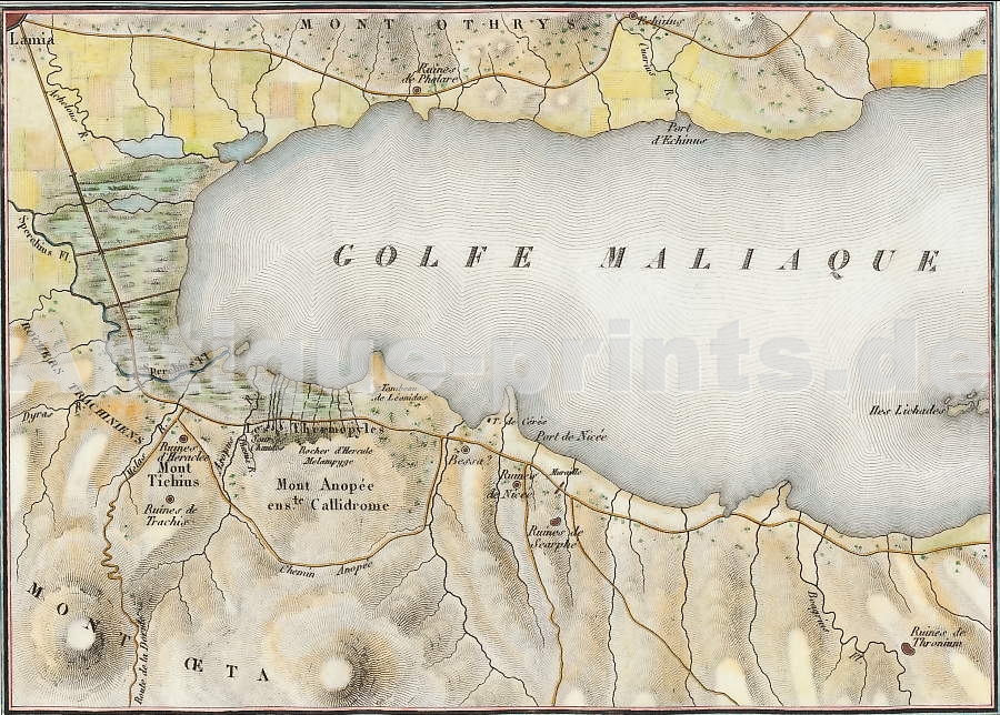 Grèce. Lithographie de A. Deveria d´après le Comte de Forbin. 1843. Très bon état. Aquarellée à la main. 20,5x16,5cm. Montée sous passe-partout.