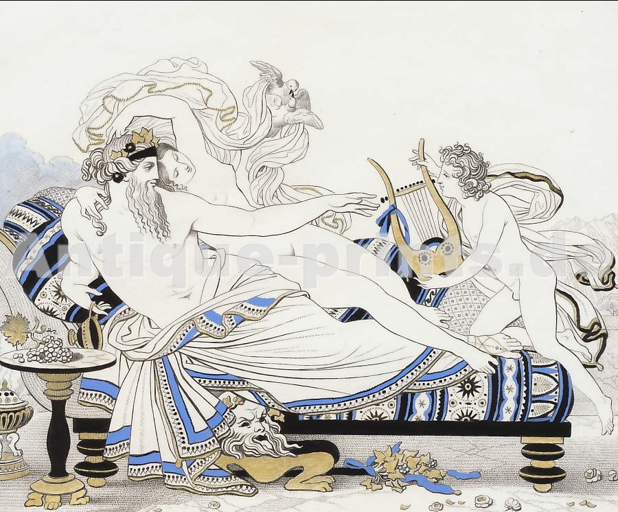 Mythologie. Gravure sur acier, gravée par Doherty d´après Moreau le Jeune. 1860. Bon état. Sur chine appliqué. Aquarellée à la main. 9x6cm. Montée sous passe-partout.