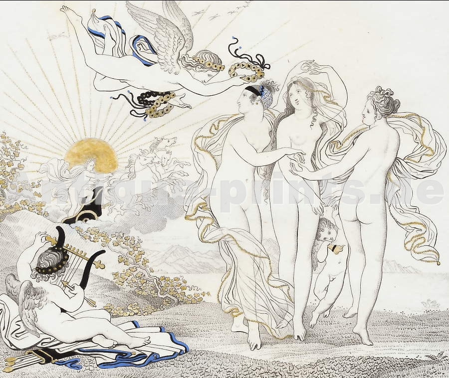 Mythologie. Eau-forte gravée par Gounod, terminée par Massard, d´après Vauthier. 1804. Bon état, petits trous de vers restaurés. Aquarellée et gouachée à la main. 17,5x11,5cm. Montée sous passe-partout.