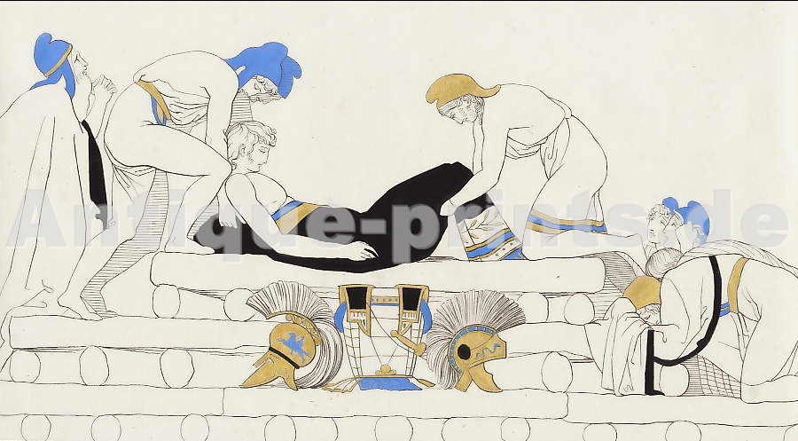 Iliade. Gravure au trait, gravée par Feillet et Laqueson d´après John Flaxman. 1827. Très bon état. Aquarellée à la main. 24x16,5cm. Montée sous passe-partout.