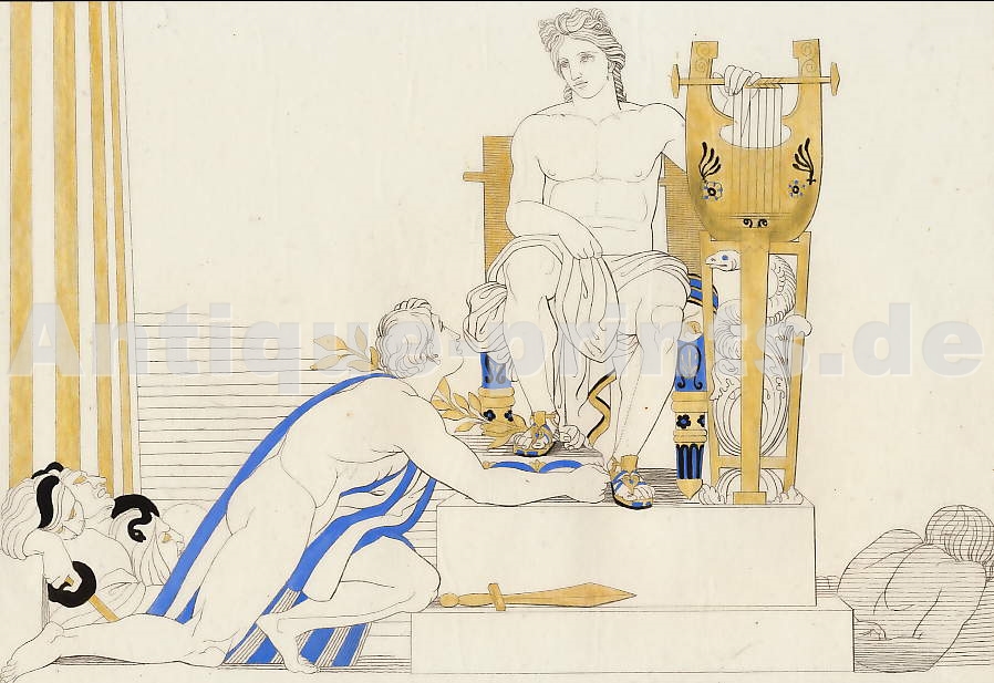 Odyssée. Gravure au trait, gravée par E. A. Réveil d´après John Flaxman. 1835. Très bon état. Aquarellée à la main. 21x12cm. Montée sous passe-partout.