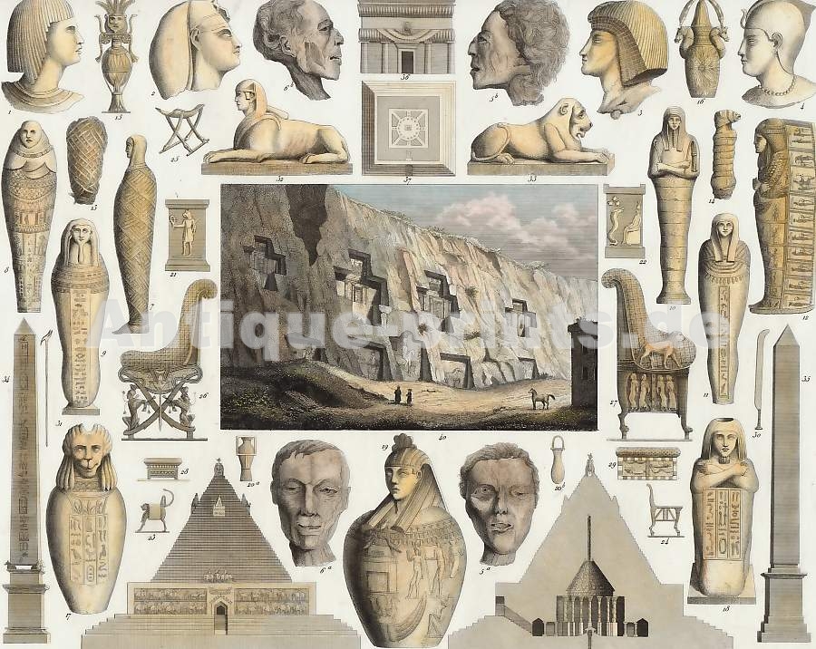 1-4. Egyptian Features and Headdresses, from Monuments, 5ab. Heads of Male Mummies, 6ab. Heads of Female Mummies, 7. Mummy with the Inner Fillets, 8. Mummy with the Exterior Cover, 9-11. Mummies with the Coffins, 12. Coffin with its Cover, 13-14. Embalmed Animals, 15-16. Vases, 17-19. Large Stone Vases, 20ab. Pitchers, 21-22. Altars, 23-24. Chairs, 25. Folding Chair, 26-27. Thrones, 28-29. Lounge and Footstool, 30. Knife, 31. Royal Sceptre, 32-33. Sphinxes, 34-35. Obelisks, 36. Entrance to the Egyptian Labyrinth, 37-39. Indian Pyramids, Ground Plan, Elevation, and Section, 40. Rock-Tombs near Persepolis.
