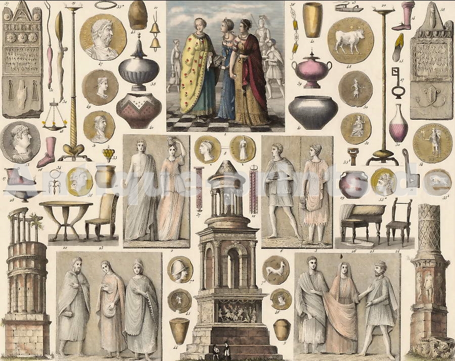 1. Gallic Women of the Roman Time, 2-6. Bas-Reliefs from Gaul, 7-8ab. Gallic Coins, 9-10. Gallic Sepulchral Urns, 11-39. Various Gallic Trinkets and Utensils, 40-42. German Sepulchral Urns, 43-56. Coins, Medals, and Matrices, 57-58. Carthaginian Monuments, 59-60. Gallic Monuments, 61.The Roman Column at Cussy.