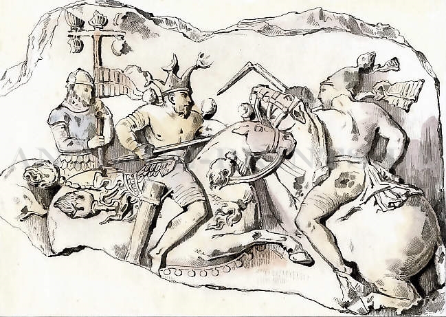 Varia. Gravure sur acier, gravée par J. Brown d´après F. R. Roffe (sculpture de H. Weekes). 1853. Très bon état. Aquarellée à la main. 21,5x6cm. Montée sous passe-partout.