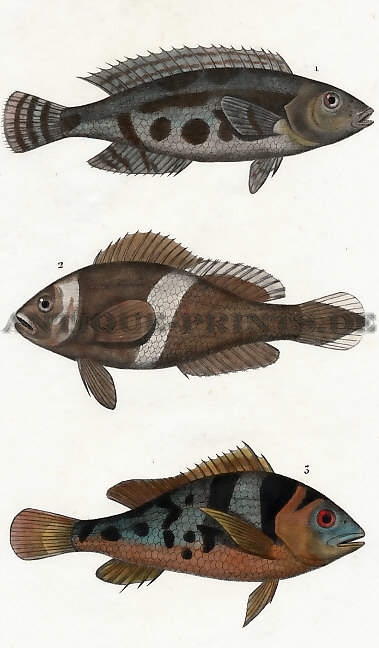 Ichthyology. Original copper engraving, engraved by David after J.-G. Prêtre. 1825. Very good condition. Hand-coloured. 15,5x9cm. Matted.
