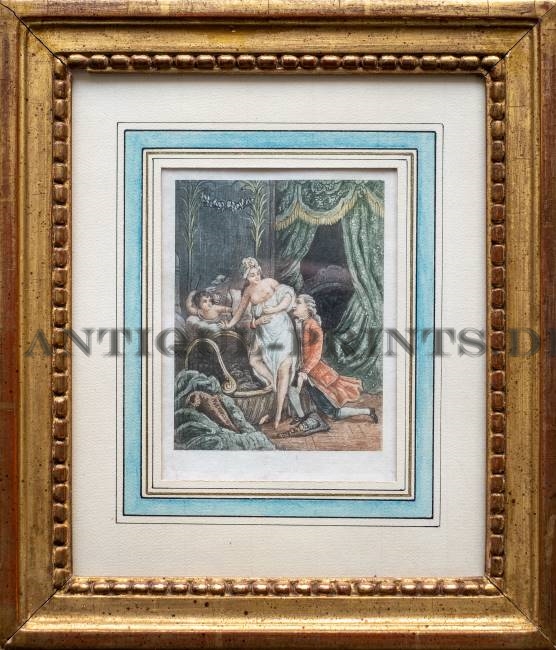 Genre. Eau-forte imprimée en couleurs. Fin du XVIIIème siècle. Très bon état. 11x8cm. Avec cadre*: 26x22cm. Envoi par DHL uniquement.