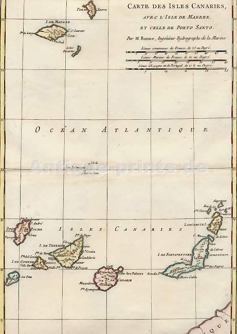 Spain & Portugal. Original small map by Robert De Vaugondy. Copper engraving. Paris, 1750. Good condition. Small margins. Outline hand-coloured. 15,5x15cm. Matted.