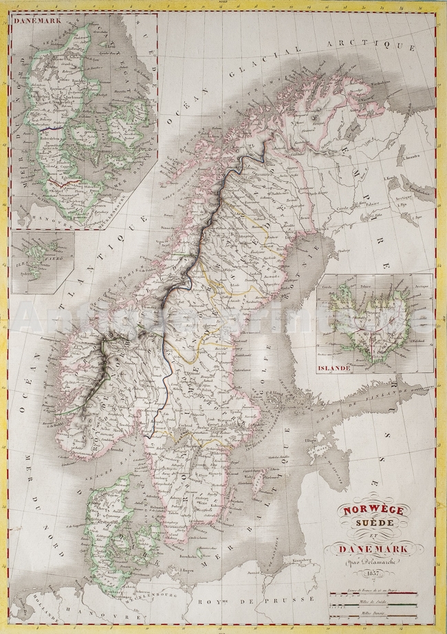 Norwegen, Schweden und Dänemark. Kupferkarte von F. Delamarche. 1837. Guter Zustand. Althankolorierte Konturen. Handkoloriert. 41x29cm.