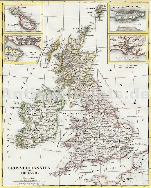 Îles Britanniques. Gravure sur acier, gravée par J. L. von Baehr d´après P. Weber. 1856. Légères rousseurs dans les marges. Aquarellée à la main. 26x20,5cm. Montée sous passe-partout.