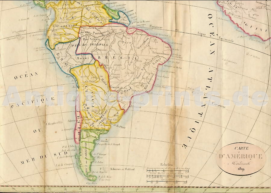 Amérique du Sud. Carte gravée sur cuivre par E. Collin, Paris, 1819. Bon état. Pliures. Couleurs originales. 32,5x23,5cm.