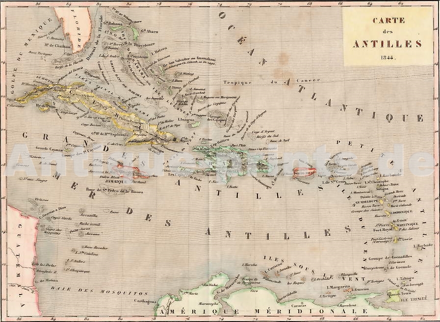Antilles. Carte gravée sur acier. Paris, 1844. Quelques rousseurs. Pliures. Aquarellée à la main. 22,5x16,5cm. Montée sous passe-partout.