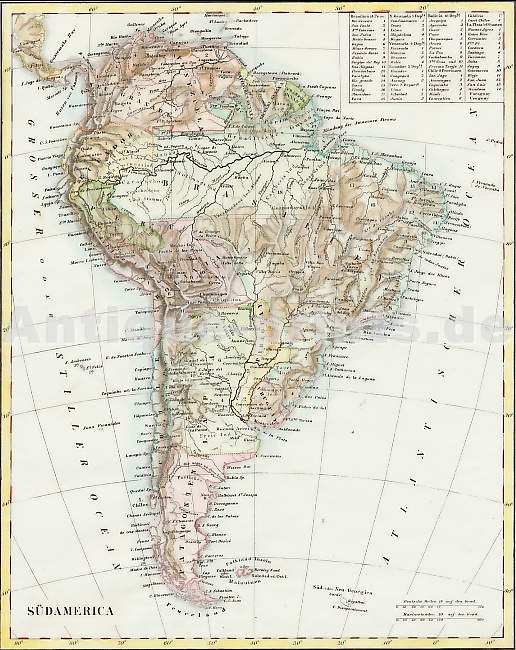 South America. Original map on steel, engraved by H. Eberhardt. Eisenach, 1856. Good condition. Hand-coloured. 26x20,5cm. Matted.