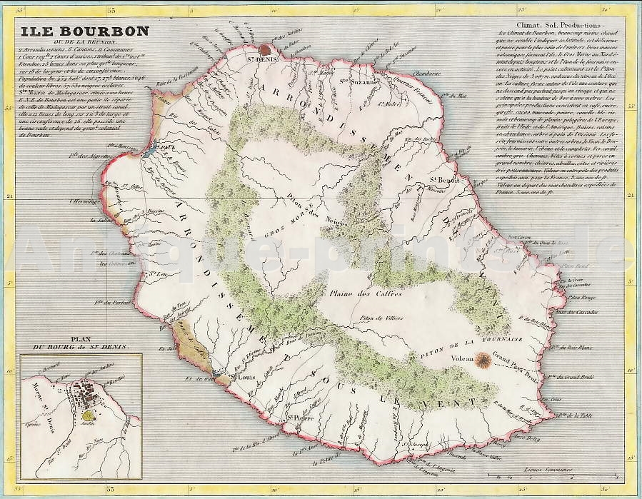 La Réunion. Carte sur acier, gravée par Alès d´après Monnin. 1833. Très bon état. Aquarellée à la main. 23,5x18,5cm. Montée sous passe-partout.