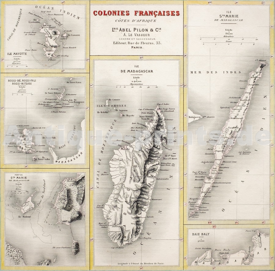 Madagascar & Mayotte. Carte sur cuivre de G. Lorsignol. Paris, Le Vasseur. 1876. Bon état. Contours en couleur d´origine. 29,5x29cm.