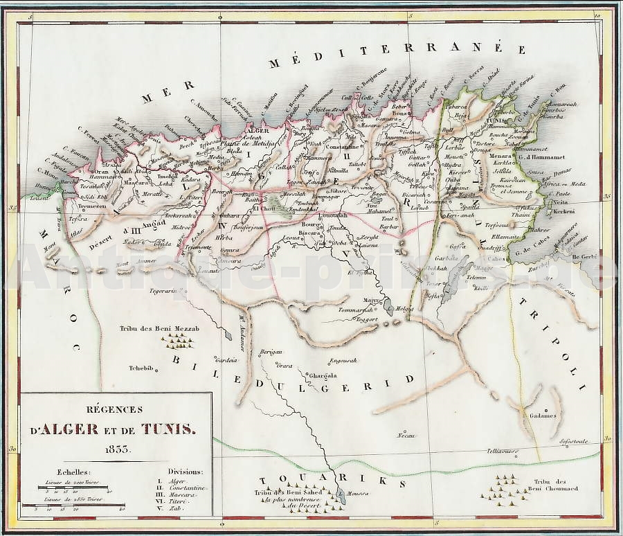 Afrique du Nord. Carte De La Partie Septentrionale D´Afrique ou de la Barbarie, contenant les royaumes de Tripoli, de Tunis, d´Alger, de Fez et de Maroc, par M. Bonne, Ingénieur-hydrographe de la Marine. Carte gravée sur cuivre par Rigobert Bonne. Genève, 1780. Très bon état. Pliure centrale. Aquarellage à la main. 32x21cm.
