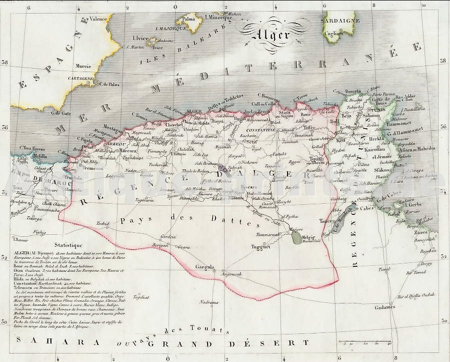 Algérie. Carte sur acier, gravée par H. Dandeleux d´après Michel. 1835. Très bon état. Aquarellée à la main. 23x18,5cm. Montée sous passe-partout.