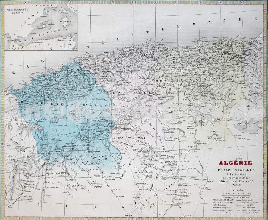 Algérie. Gravure sur cuivre par G. Lorsignol. Paris, Le Vasseur. 1876. Bon état, légères salissures dans les marges. Aquarellage d´époque. 38x31,5cm.