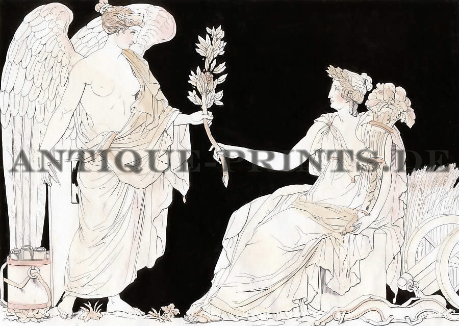 Allegory. Original copper engraving, engraved by C. Normand after A. Tardieu (Bas-relief by P.-L. Roland). 1822. Good condition, wrinkles. Hand-coloured. 30,5x19cm.