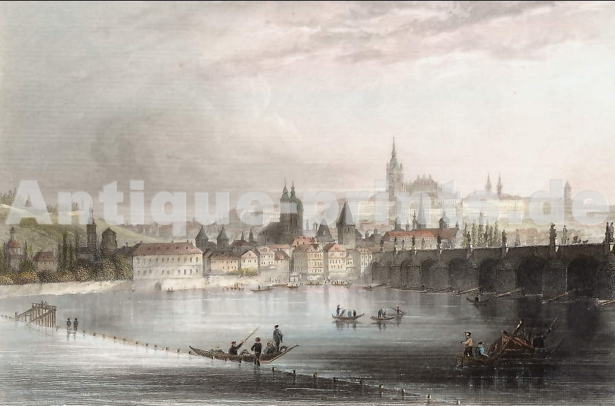India. Original steel engraving, engraved by E. Challis after S. Prout. 1833. Very good condition. Hand-coloured. 19,5x12,5cm. Matted.