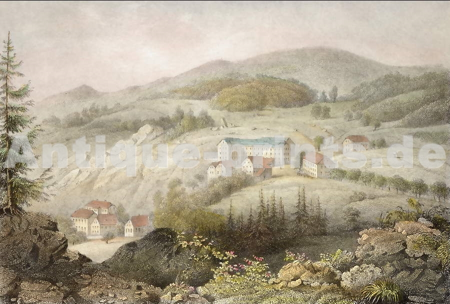 Czechia. Original multiview engraving on steel. 1851. Very good condition. Decorative border. Hand-coloured. 19x15cm. Matted.