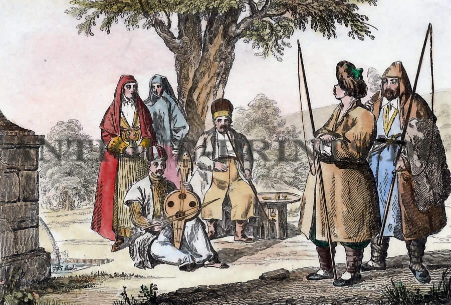 Spain. Original wood engraving drawn by E. Grandsire, engraved by C. Barbant. 1878. Good condition. Hand-coloured. 18,5x13cm. Matted.