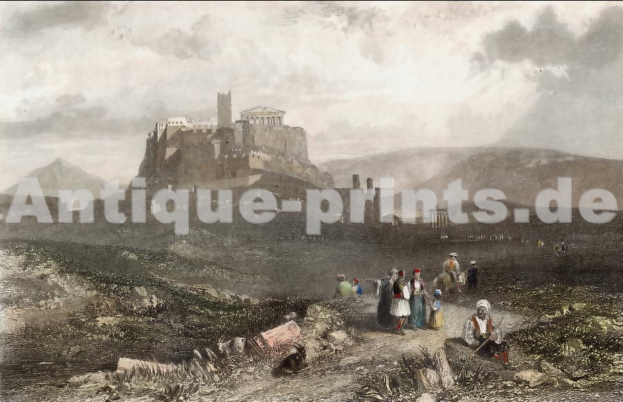 Grèce. Gravure sur acier, gravée par E. Finden d´après W. Turner. 1832. Très bon état. Aquarellée à la main. 9x8cm. Montée sous passe-partout.