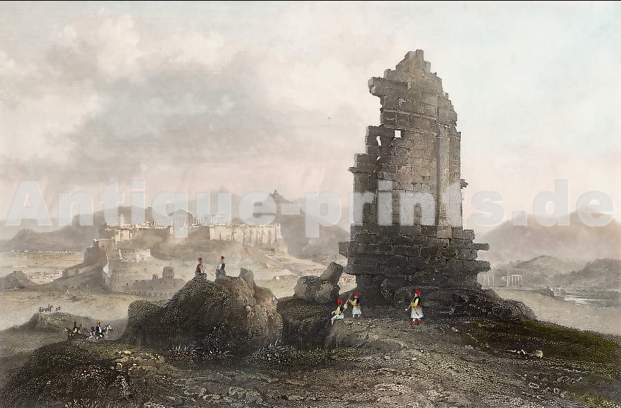 Grèce. Gravure sur acier, gravée par J. Cousen d´après W. H. Bartlett. 1847. Très bon état. Aquarellée à la main. 17,5x12cm. Montée sous passe-partout.