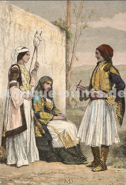 Grèce. Gravure sur bois, gravée par Laly d´après K. Girardet. 1860. Très bon état. Texte au verso. Aquarellage ancien. 23,5x15,5cm. Montée sous passe-partout.