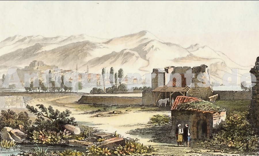 Greece. Original steel engraving drawn by G. Cattermole, engraved by E. Finden. 1837. Very good condition. Hand-coloured. 13x8,5cm. Matted.
