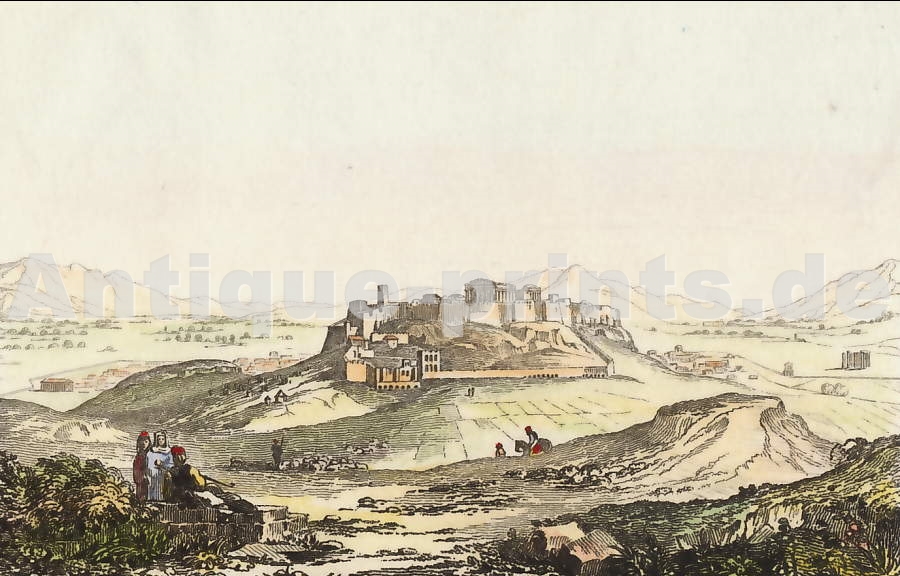 Grèce. Gravure sur acier, gravée par J. Sands d´après C. Bentley. 1840. Très bon état. Aquarellée à la main. 19x12cm. Montée sous passe-partout.