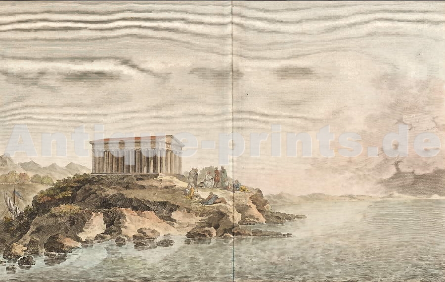 Grèce. Aquatinte originale gravée par A. Sasso. 1827. Légères rousseurs. Aquarellage d´époque. 14x10,5cm. Montée sous passe-partout.